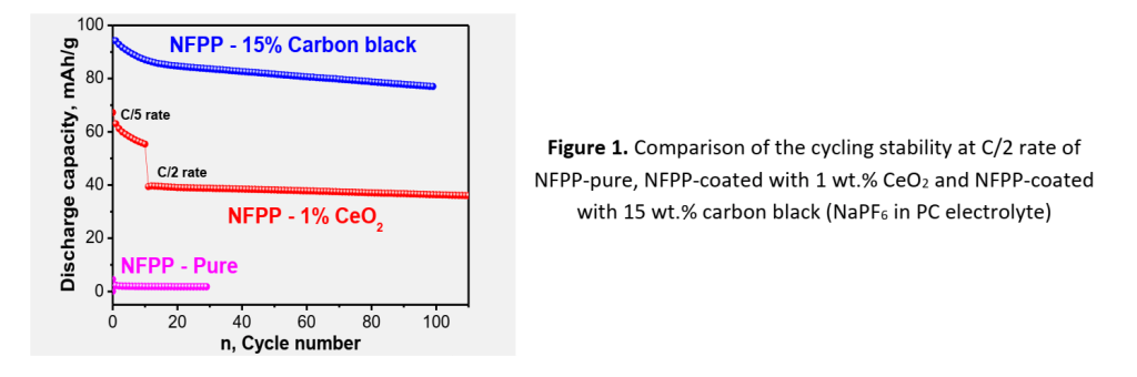 The results obtained show: (i) Coating NFPP with even 1 wt.% CeO2 leads to a drastic increase in the specific capacity of the cell with good cycling stability and 100 % Coulombic efficiency in comparison with pure NFPP; (ii) The specific capacity of NFPP coated with 15 wt.% carbon black is higher, but at the expense of the significantly decreased volumetric energy density.