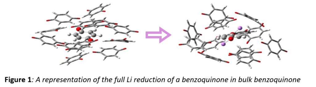 This study is focused on the development of a novel protocol for calculation of the electrode potential in the bulk of the electrode. On the one hand, standard DFT/PCM calculations were carried out searching for relationship between the electrode potential, the dielectric constant of the medium and the electric properties of the redox-active organic molecule before and after reduction with Li. On the other hand, a cluster cut out of the crystal structure of the target compound is modelled by means of an ab initio calculation with twolayered ONIOM (Figure 1) approach before and after the reduction of a separate molecule in it, in order to analyse the structural changes invoked by the reduction and their effect on the overall electrostatics.