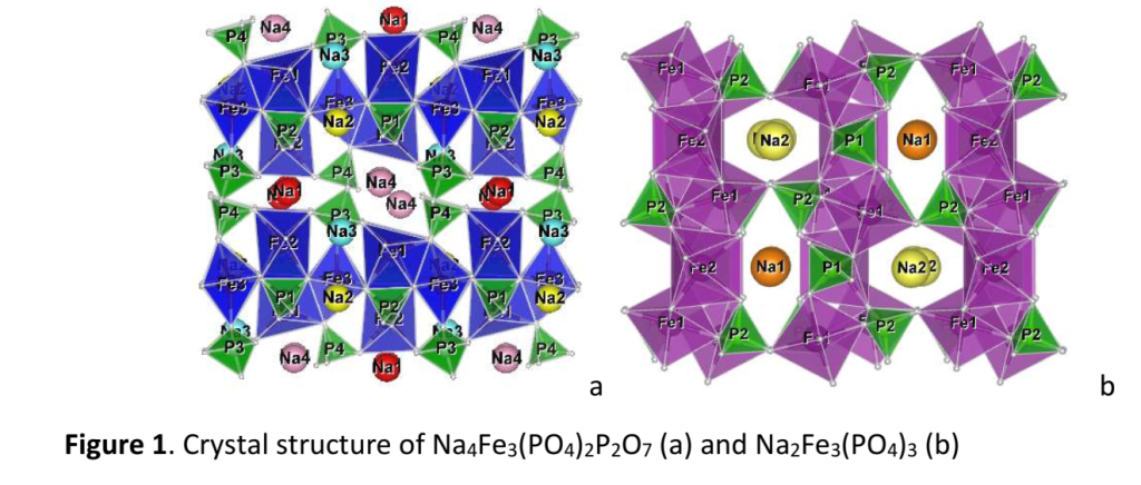 Here, we first report electrochemical properties of tunnel–type sodium iron phosphates, Na4Fe3(PO4)2P2O7 and Na2Fe3(PO4)3 (Fig. 1), in sodium half-cells using NaFSI:[Pyr13]+[FSI]-electrolyte (Pyr13FSI is N-methyl-N-propylpyrrolidinium bis-(fluorosulfonyl)imide) (1:9 mole ratio).