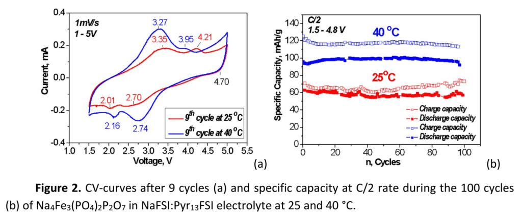 To date, only limited phosphate-based positive electrode materials such as NaFePO4, Na2FeP2O7 and Na3V2(PO4)3 have been investigated using ILs as electrolytes and very promising electrochemical characteristics in terms of energy density and capacity retention that outperform the organic electrolyte-based devices have been reported.